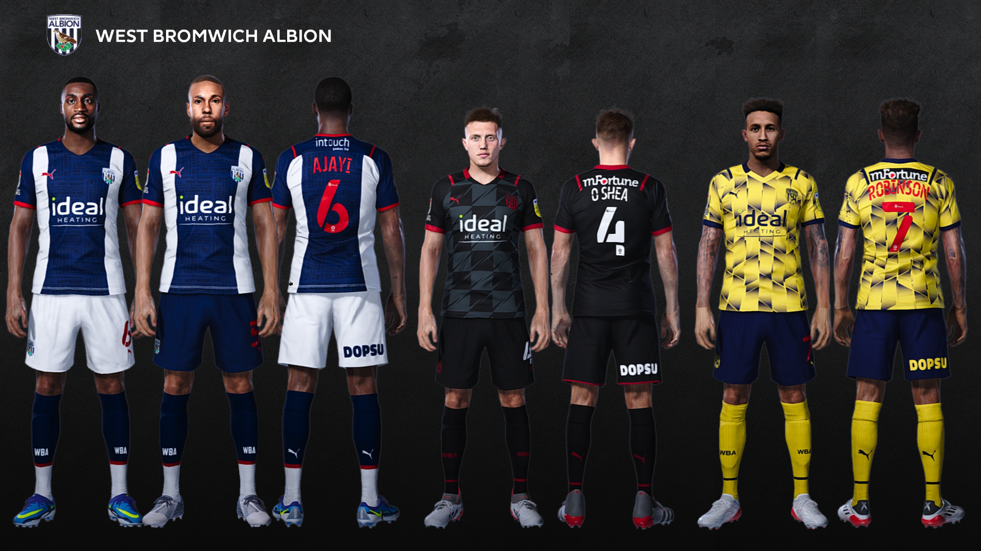Full set of kits for the Championship team West Bromwich Albion compatible with eFootball Pro Evolution Soccer 2021.